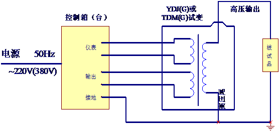 把電源輸入有過流自動脫扣及防止突發(fā)加壓的零位連鎖裝置的操作箱,經自耦調壓器調節(jié)電壓輸入YDQ-J試驗變壓器初級繞組,根據電磁感應原理,在次級(高壓)繞組按其與初級繞組匝數(shù)之比可獲得同等倍數(shù)的電壓幅值-工頻高壓。