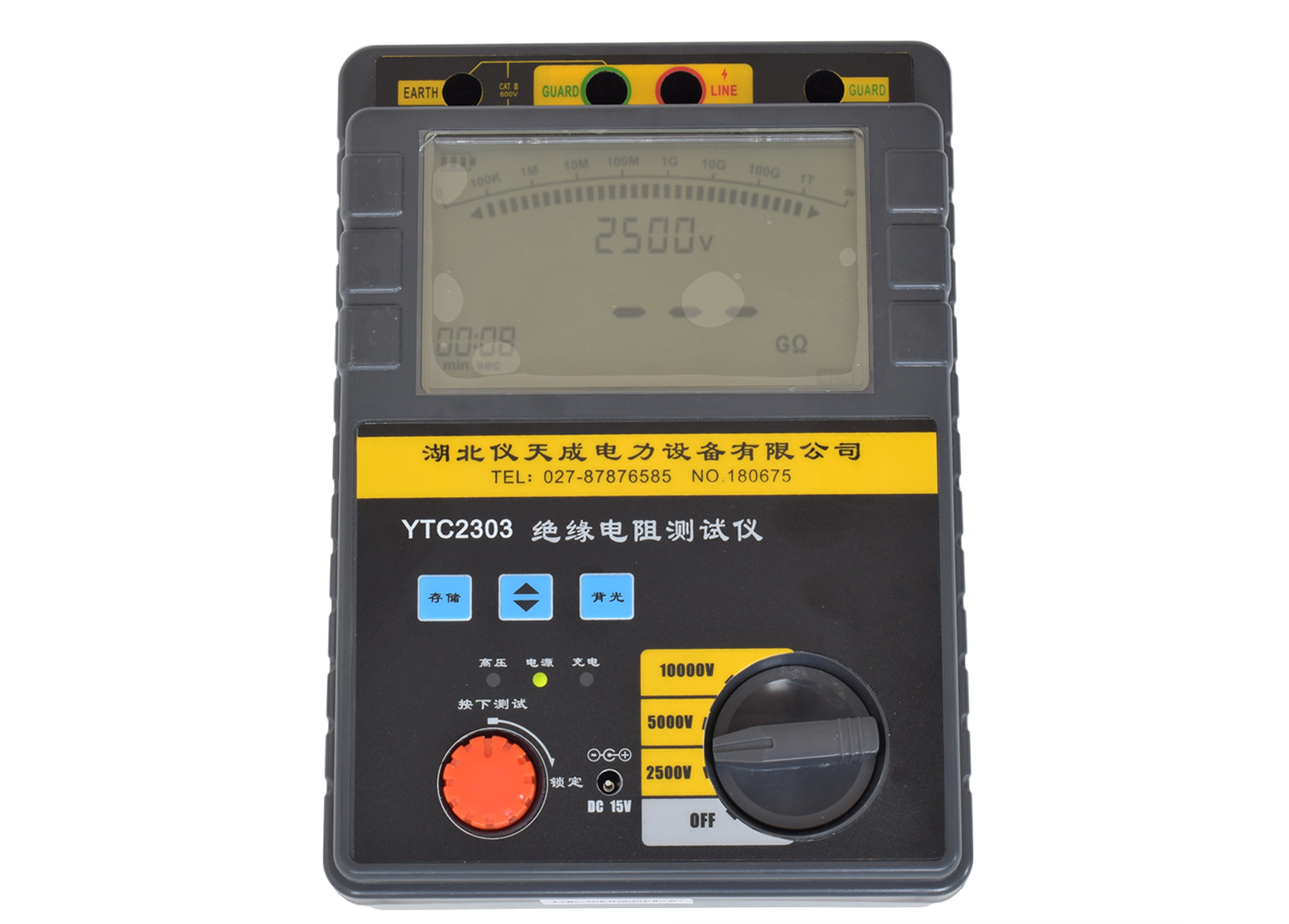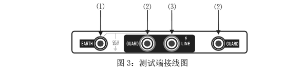 3、將帶高壓測(cè)試線紅色插頭端插入(3)LINE端,綠色插頭端插入(2)GUARD端,另一端探針或夾子接于被試設(shè)備的高壓導(dǎo)體上。將測(cè)試線副線(綠色)插入(2)GUARD端(右手邊),另一端接于被試設(shè)備的高壓護(hù)環(huán)上,以消除表面泄漏電流的影響(詳見“屏蔽端的使用方法”相關(guān)內(nèi)容。將另外一根黑色副線測(cè)試線插入地端(EARTH)(1)端,另一頭接于被試設(shè)備的外殼或地上。